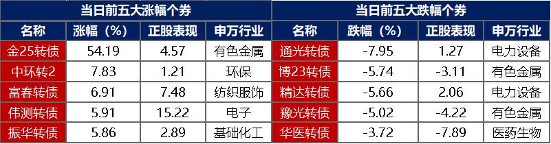 【转债市场主要指数集体跟涨】 10月27日,转债市场跟随权益市场继续上行,当日中证转债、上证转债、深证转债分别收涨0.83%、0.84%、0.81%。当日,转债市场成交额702.33亿元,较前一交易日放量90.21亿元。转债市场大多上涨,411支转债中,326支收涨,72支下跌,13支持平。当日上涨个券中,新上市金25转债涨超54%,中环转2涨超7%,富春转债涨超6%;下跌个券中,通光转债跌逾7%,博23转债、精达转债、豫光转债跌逾5%。
