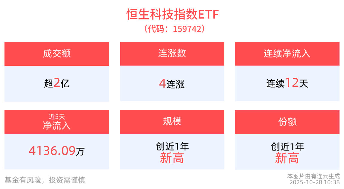 规模方面,恒生科技指数ETF最新规模达46.41亿元,创近1年新高。