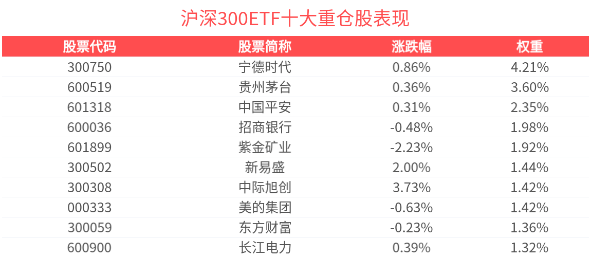 数据显示,截至2025年9月30日,沪深300指数前十大权重股分别为宁德时代(300750)、贵州茅台、中国平安、招商银行、紫金矿业、新易盛、中际旭创、美的集团、东方财富、长江电力,前十大权重股合计占比21.49%。