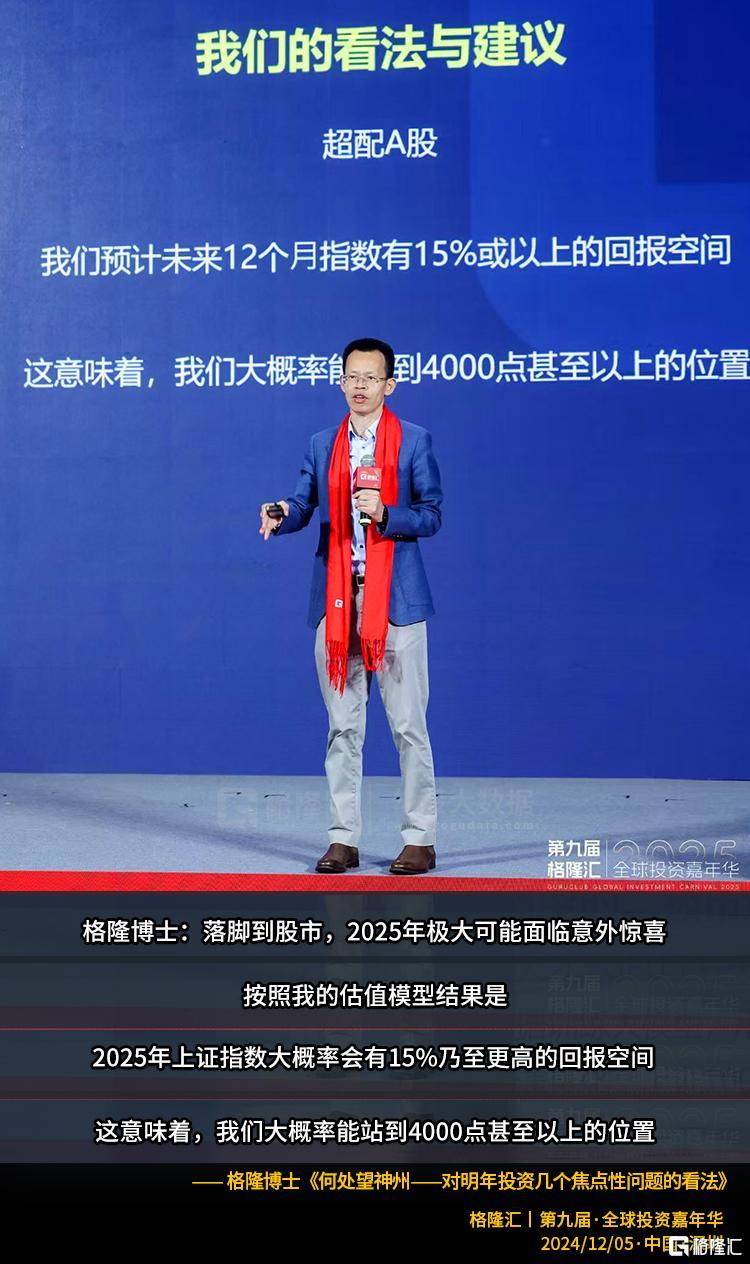 2024年12月5日,在深圳举行的格隆汇第九届全球投资嘉年华现场,格隆博士曾掷地有声地预言:“2025年A股市场极大可能面临意外惊喜,按照我的估值模型,2025年上证指数大概率会有15%乃至更高的回报空间,这意味着,我们大概率能站到4000点甚至以上的位置。”如今,这一预判正一步步成为现实。