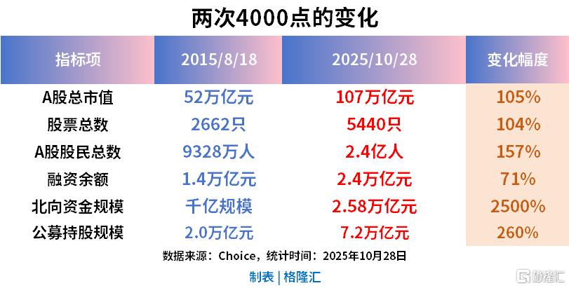 今日,沪指时隔十年再次站上4000点之上,虽同为4000点,但与2015年8月18日时相比,A股市场已发生巨大变化,网友戏称的“大A”已经不再是当年的“大A”了。