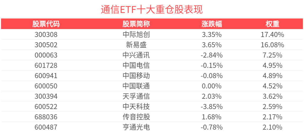 数据显示,截至2025年9月30日,国证通信指数前十大权重股分别为中际旭创、新易盛、中兴通讯、中国电信、中国移动、中国联通、天孚通信、中天科技、传音控股、亨通光电,前十大权重股合计占比66.02%。