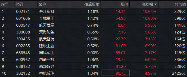 风险提示:国防军工ETF被动跟踪中证军工指数,该指数基日为2004.12.31,发布于2013.12.26。2020-2024年分年度历史收益分别为:67.91%、14.28%、-25.74%、-11.02%、8.20%。指数成份股构成根据该指数编制规则适时调整,其回测历史业绩不预示指数未来表现。以上个股均为标的指数成份股,仅作展示,个股描述不作为任何形式的投资建议,也不代表管理人旗下任何基金的持仓信息和交易动向。基金管理人评估的本基金的风险等级为R3-中风险,适宜平衡型(C3)及以上投资者,适当性匹配意见请以销售机构为准。任何在本文出现的信息(包括但不限于个股、评论、预测、图表、指标、理论、任何形式的表述等)均只作为参考,投资人须对任何自主决定的投资行为负责。另,本文中的任何观点、分析及预测不构成对阅读者任何形式的投资建议,亦不对因使用本文内容所引发的直接或间接损失负任何责任。基金投资有风险,基金的过往业绩并不代表其未来表现,基金管理人管理的其他基金的业绩并不构成基金业绩表现的保证,基金投资须谨慎。