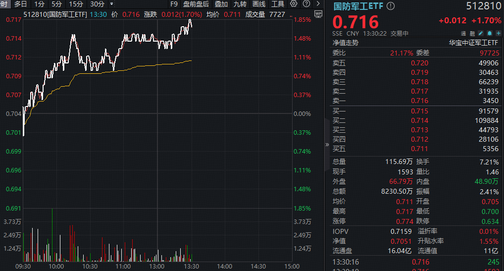 场内热门国防军工ETF(512810)午后再度发力,最高上探1.85%,实时成交超8200万元,盘中频现溢价,显示多头势力较强。