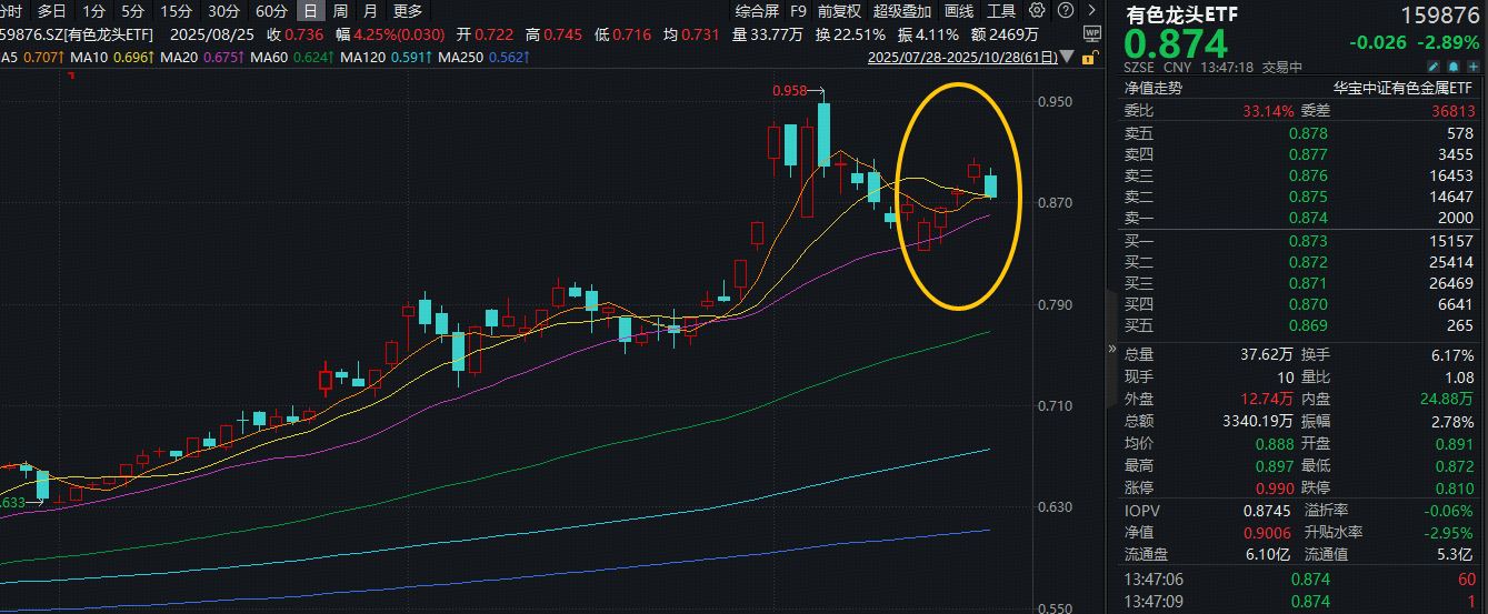盘面上,今日(10月28日)揽尽有色金属行业龙头的有色龙头ETF(159876)场内价格一度重挫3%,现跌2.89%,这是该ETF日线3连涨后的首跌,或成为资金逢跌布局时机。