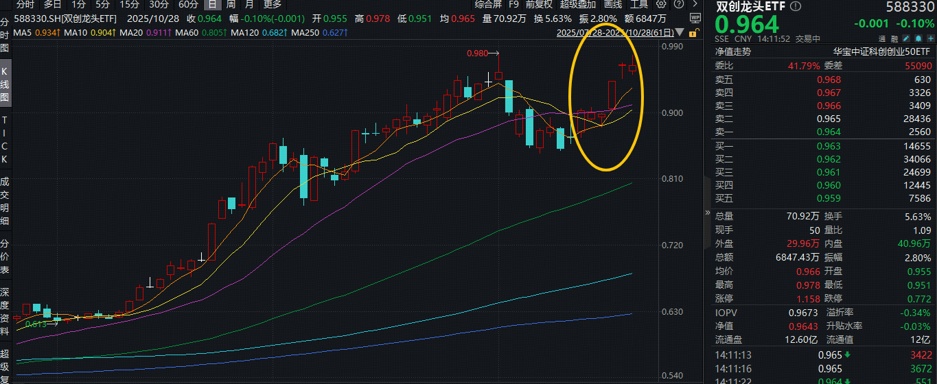 今日(10月28日)覆盖创业板+科创板龙头的硬科技宽基——双创龙头ETF(588330)场内价格盘中涨逾1.2%,现跌0.1%,实时成交额超6800万元,交投较为活跃!