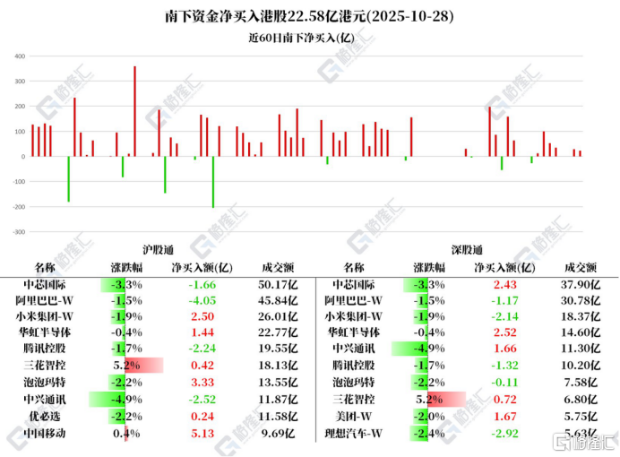 10月28日,南下资金今日净买入港股22.58亿港元。