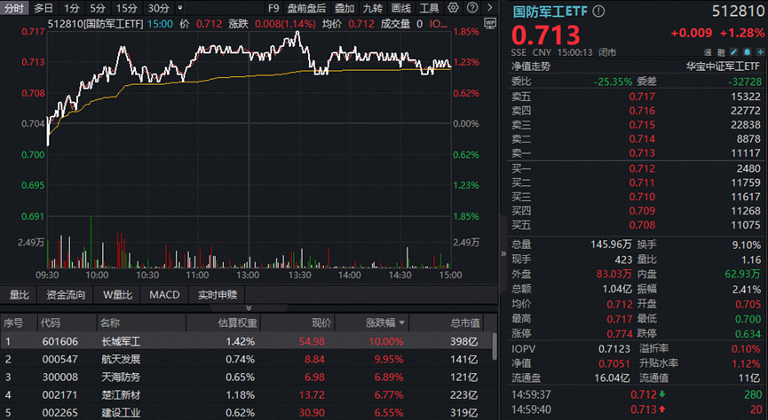 行业代表性国防军工ETF(512810)盘中上探1.85%,场内收涨1.28%,在全市场1331只上市ETF中跻身TOP5!全天放量成交1.04亿元。