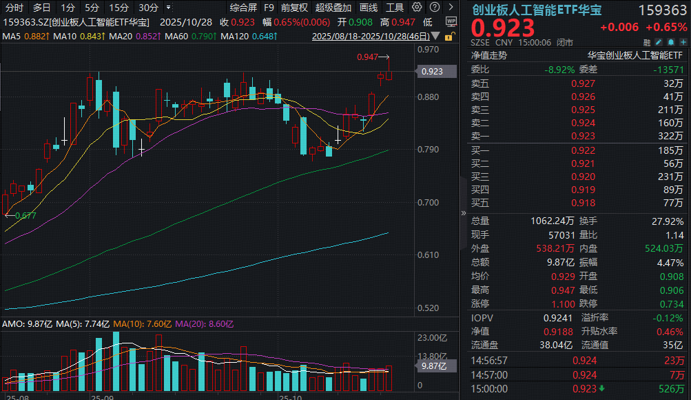 同类比较看,截至10月24日,创业板人工智能ETF(159363)最新规模超34亿元,近1个月日均成交额超8亿元,规模、交投在跟踪创业板人工智能指数的7只ETF中高居第一。