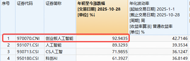 时间拉长看,上周以来,受多重利好催化,以光模块为核心的算力硬件持续起飞,助力创业板人工智能由阶段低点反弹。截至10月28日,创业板人工智能指数年内涨幅已达93%,显著领跑CS人工智、人工智能、科创AI等同类AI主题指数!
