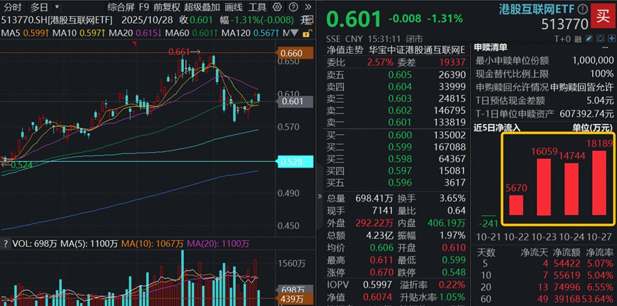 港股互联网ETF(513770)最新规模已突破100亿元,年内日均成交额超6亿元,支持日内T+0交易,不受QDII额度限制,流动性佳!