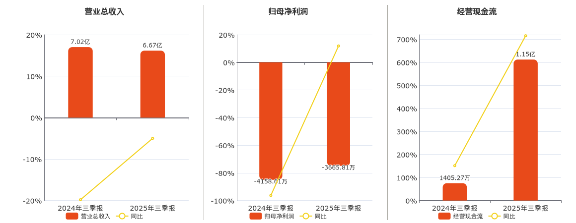 公司营业总收入为6.67亿元。归母净利润为-3665.81万元,较去年同报告期归母净利润增加492.79万元。经营活动现金净流入为1.15亿元,在已披露的同业公司中排名第6,较去年同报告期经营活动现金净流入增加1.01亿元,实现2年连续上涨,同比较去年同期上涨715.36%。