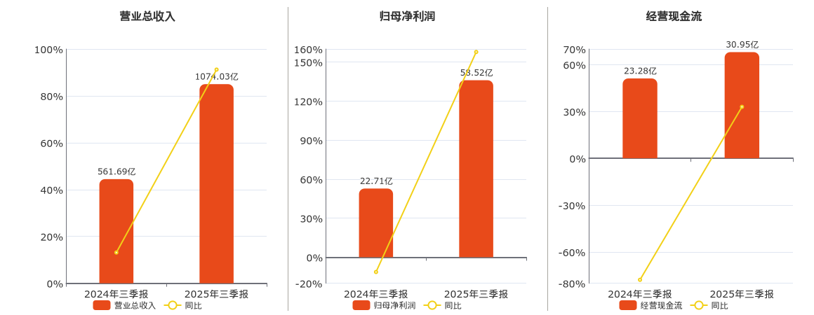 公司营业总收入为1074.03亿元,在已披露的同业公司中排名第1,较去年同报告期营业总收入增加163.55亿元,实现4年连续上涨,同比较去年同期上涨17.96%。归母净利润为58.52亿元,在已披露的同业公司中排名第1,较去年同报告期归母净利润增加31.35亿元,实现5年连续上涨,同比较去年同期上涨115.41%。经营活动现金净流入为30.95亿元,在已披露的同业公司中排名第1。