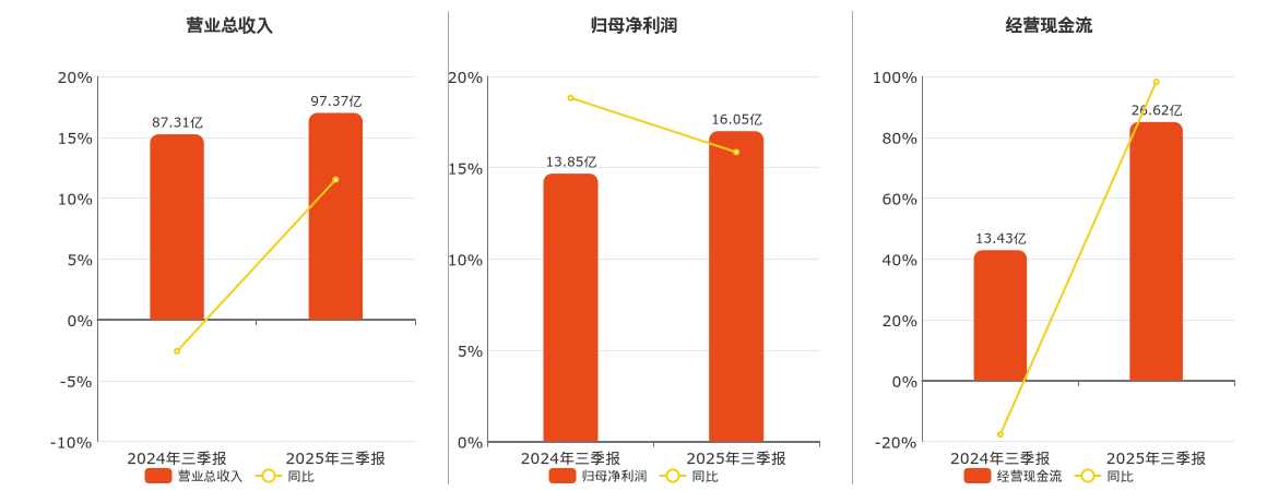 公司营业总收入为97.37亿元,在已披露的同业公司中排名第3,较去年同报告期营业总收入增加10.06亿元,同比较去年同期上涨11.52%。归母净利润为16.05亿元,在已披露的同业公司中排名第3,较去年同报告期归母净利润增加2.20亿元,实现3年连续上涨,同比较去年同期上涨15.85%。经营活动现金净流入为26.62亿元,在已披露的同业公司中排名第1,较去年同报告期经营活动现金净流入增加13.19亿元,同比较去年同期上涨98.21%。