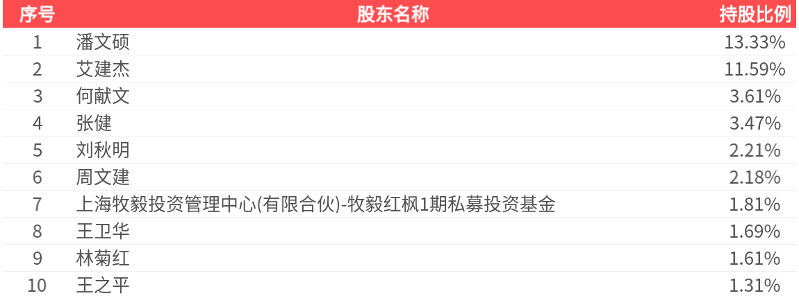 公司股东户数为1.09万户,前十大股东持股数量为4337.05万股,占总股本比例为42.81%,前十大股东持股情况如下: