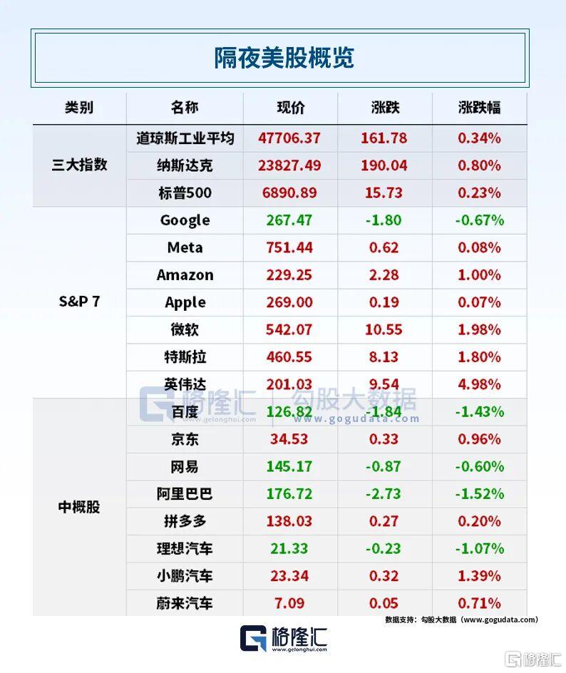美股方面,三大指数齐升,标普500指数涨0.23%,道指涨0.34%,纳指涨0.80%。英伟达涨4.98%续创新高,市值一夜增加2318亿美元(约合人民币16456.18亿元),总市值逼近5万亿美元;微软涨约2%,总市值重新站上4万亿美元,特斯拉涨近2%,亚马逊涨1%,Meta和苹果涨幅不到0.1%,谷歌A则收跌0.67%。