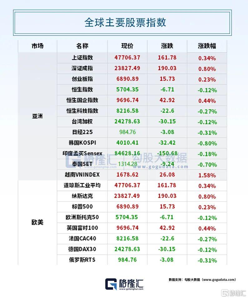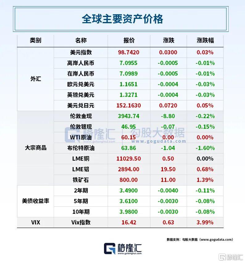 全球资产表现上,COMEX黄金期货跌0.73%,报2954.1美元/盎司;COMEX白银期货跌0.63%,报47.025美元/盎司。国际油价微跌,WTI原油期货结算价不变,报60.15美元/桶;布伦特原油期货结算价收跌1.60%,报63.86美元/桶。