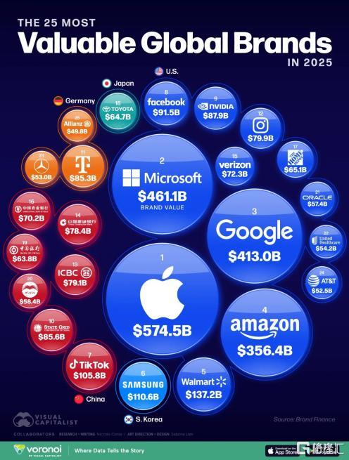 10月28日,BrandFinance发布2025全球品牌价值TOP25榜单,科技企业主导格局。苹果以5745亿美元蝉联第一,微软(4611亿)、谷歌(4130亿)、亚马逊(3564亿)紧随其后。TikTok以1058亿位列第七,英伟达凭AI硬件优势以879亿跃居第九。中国有6家企业上榜,包括:国家电网(856亿)、工商银行(791亿)、建设银行(784亿)、农业银行(702亿)、中国银行(638亿)和贵州茅台(584亿)。
