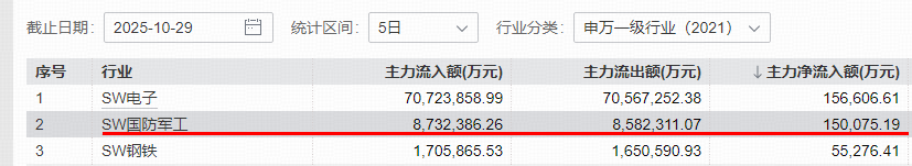 资金面出现积极信号。昨日,主力集中加码国防军工赛道,单日净买入15亿元,在31个申万一级行业中高居第二。个股方面,航天发展单日净流入5亿元,长城军工、菲利华净流入逾3亿元,楚江新材、中航成飞净流入2.7亿元左右。