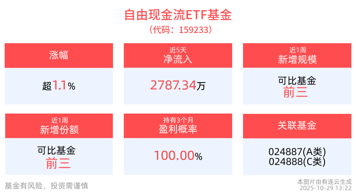 规模方面,自由现金流ETF基金近1周规模增长2485.40万元,实现显著增长,新增规模位居可比基金3/13。