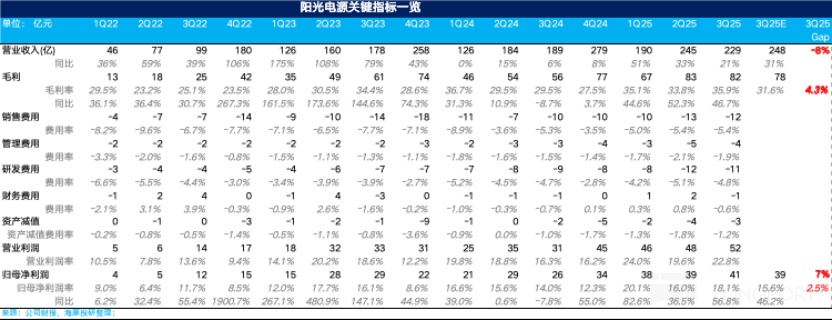 3. 三季度净利润端略超预期,主要由于毛利率的提升:三季度阳光归母净利 41.5 亿元,同比增长 57%,略高于市场预期 39 亿,而归母净利率达到了 18.1%,环比上行了 2.1 个百分点,主要由于海外业务占比提升带动的毛利率端超预期,叠加三费投入的环比减少,。