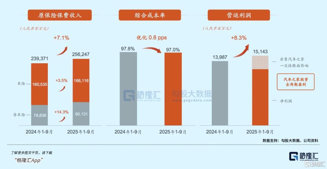 财产险业务同样表现稳健,其通过成本管控与规模增长的平衡,持续释放盈利空间。前三季度原保险保费收入2562.47亿元,同比增长7.1%;综合成本率优化至97.0%,同比下降0.8 个百分点,继续保持承保盈利状态。