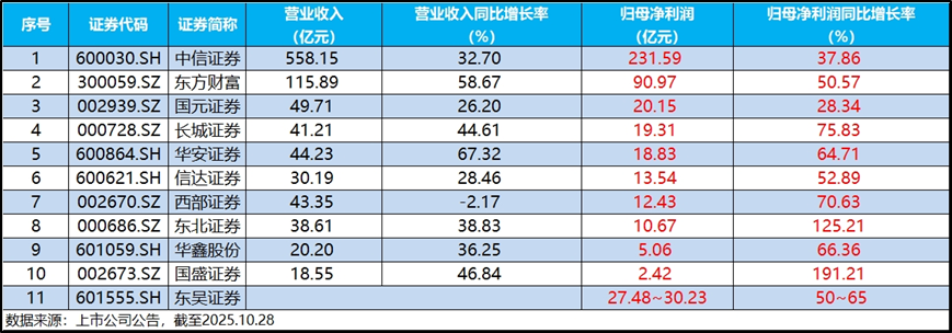 截至目前,中证全指证券公司指数囊括的49只券商股已有11只披露三季报(业绩预报),归母净利润均实现两位数正增长,国盛证券、东北证券更是涨幅翻番。券业龙头亦有不俗表现,中信证券三季度单季盈利94.40亿元,创历史新高;东方财富前三季度营收、净利增幅均超50%。