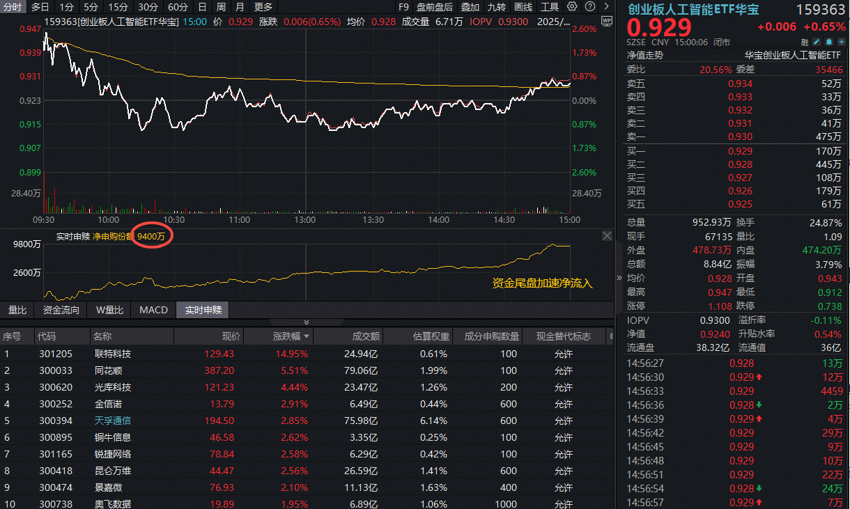热门ETF方面,同类规模最大、流动性突出的创业板人工智能ETF(159363)早盘一度上探逾2.5%,临近午盘翻绿下跌逾1%,尾盘翻红场内收涨0.65%斩获四连涨,收盘价再创新高!值得注意的是,资金尾盘加速净流入,全天净申购9400万份!