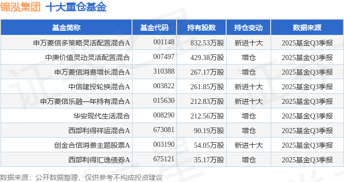 持有锦泓集团最多的基金为申万菱信多策略灵活配置混合A,目前规模为2.86亿元,最新净值2.321(10月29日),较上一交易日上涨0.17%,近一年上涨46.25%。该基金现任基金经理为梁国柱 高付。