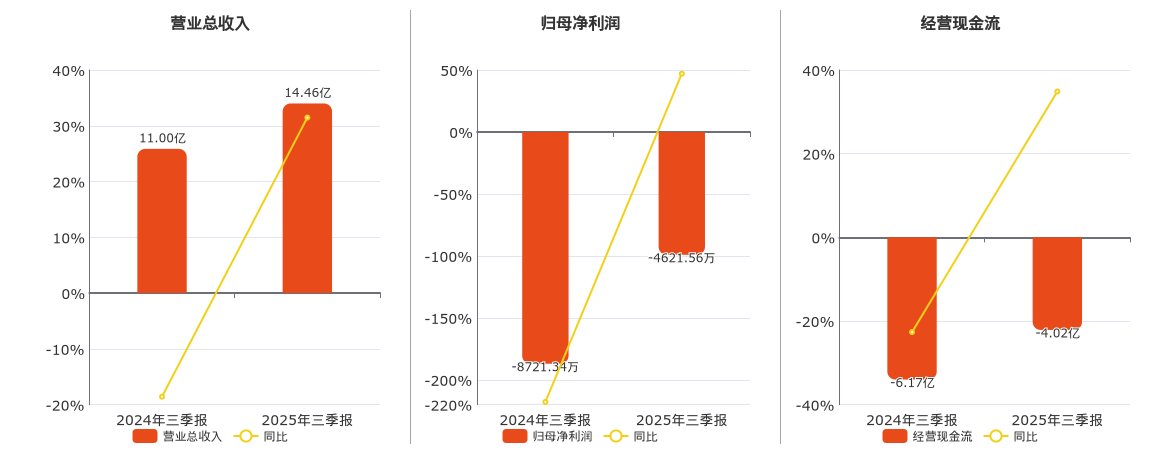 公司营业总收入为14.46亿元。归母净利润为-4621.56万元,在已披露的同业公司中排名第24。经营活动现金净流入为-4.02亿元,在已披露的同业公司中排名第24。