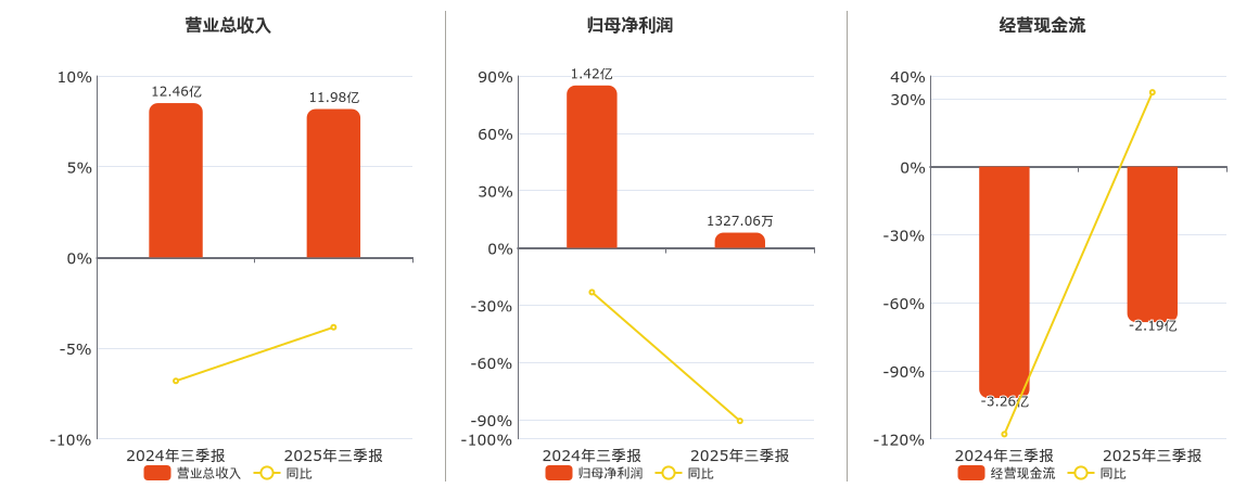 公司营业总收入为11.98亿元,在已披露的同业公司中排名第33,较去年同报告期营业总收入减少4793.00万元,同比较去年同期下降3.85%。归母净利润为1327.06万元,在已披露的同业公司中排名第49,较去年同报告期归母净利润减少1.29亿元,同比较去年同期下降90.65%。经营活动现金净流入为-2.19亿元,在已披露的同业公司中排名第89,较去年同报告期经营活动现金净流入增加1.07亿元。
