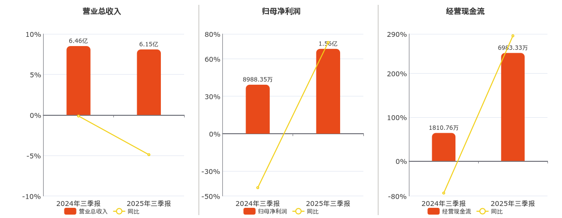 公司营业总收入为6.15亿元,在已披露的同业公司中排名第17,较去年同报告期营业总收入减少3169.74万元,同比较去年同期下降4.90%。归母净利润为1.56亿元,在已披露的同业公司中排名第15。经营活动现金净流入为6983.33万元,在已披露的同业公司中排名第18。