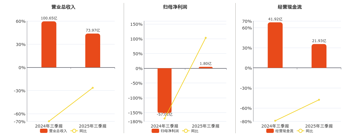 公司营业总收入为73.97亿元,较去年同报告期营业总收入减少26.67亿元,同比较去年同期下降26.50%。归母净利润为1.80亿元,在已披露的同业公司中排名第7。经营活动现金净流入为21.93亿元,较去年同报告期经营活动现金净流入减少19.99亿元,同比较去年同期下降47.69%。