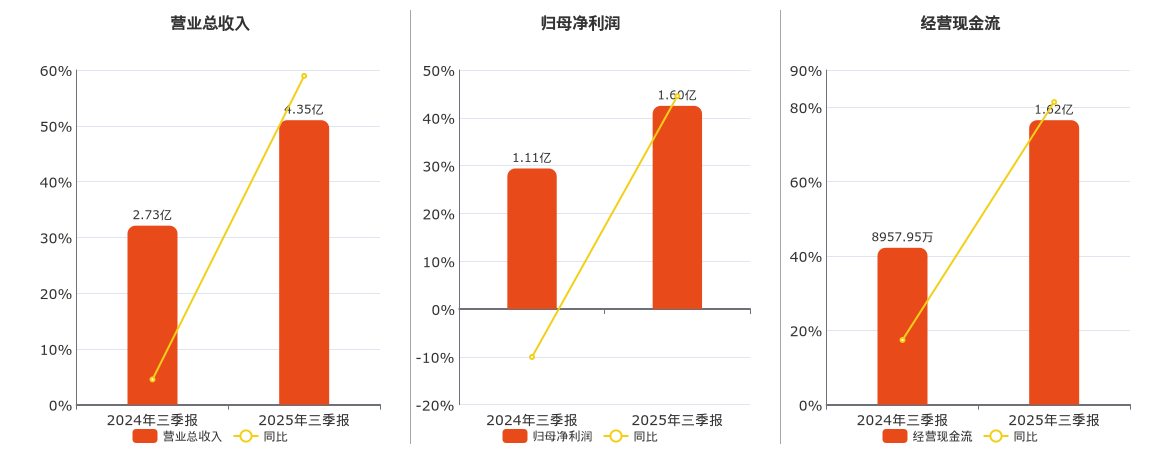 公司营业总收入为4.35亿元,较去年同报告期营业总收入增加7514.30万元,实现4年连续上涨,同比较去年同期上涨20.91%。归母净利润为1.60亿元,在已披露的同业公司中排名第3,较去年同报告期归母净利润增加3808.70万元,同比较去年同期上涨31.26%。经营活动现金净流入为1.62亿元,在已披露的同业公司中排名第4,较去年同报告期经营活动现金净流入增加6888.23万元,实现3年连续上涨,同比较去年同期上涨73.60%。