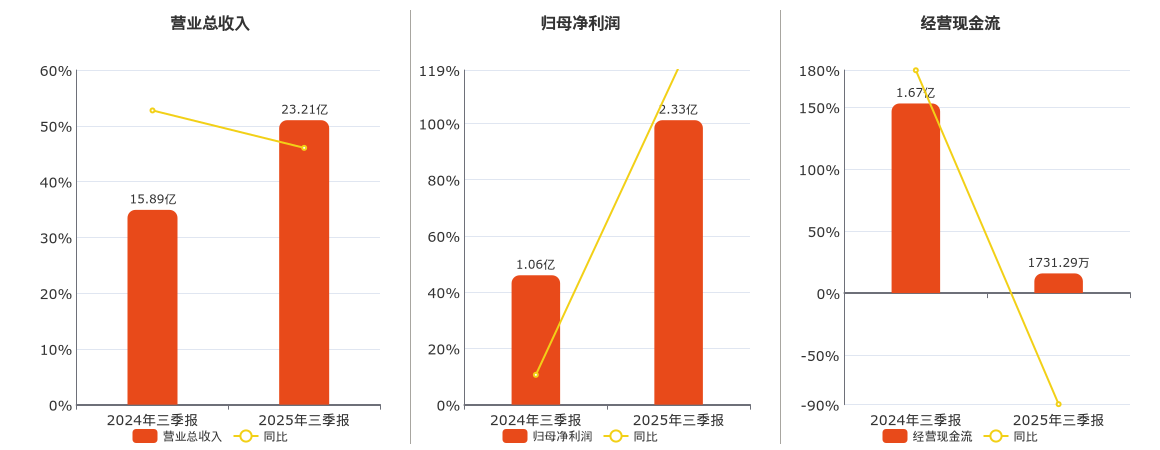 公司营业总收入为23.21亿元。归母净利润为2.33亿元。经营活动现金净流入为1731.29万元,在已披露的同业公司中排名第19,较去年同报告期经营活动现金净流入减少1.49亿元,同比较去年同期下降89.62%。