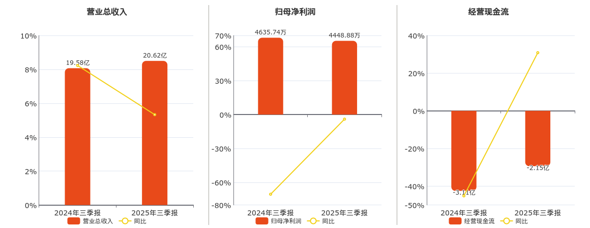 公司营业总收入为20.62亿元,在已披露的同业公司中排名第77,较去年同报告期营业总收入增加1.04亿元,实现3年连续上涨,同比较去年同期上涨5.33%。归母净利润为4448.88万元,在已披露的同业公司中排名第150,较去年同报告期归母净利润减少186.86万元,同比较去年同期下降4.03%。经营活动现金净流入为-2.15亿元,在已披露的同业公司中排名第204,较去年同报告期经营活动现金净流入增加9588.77万元。