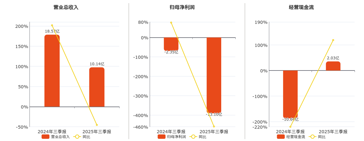 公司截至2025年9月30日,*ST南置营业总收入为10.14亿元,较去年同报告期营业总收入减少8.43亿元,同比较去年同期下降45.41%。截至2025年9月30日,*ST南置归母净利润为-13.10亿元,较去年同报告期归母净利润减少10.75亿元。截至2025年9月30日,*ST南置经营活动现金净流入为2.03亿元,较去年同报告期经营活动现金净流入增加12.66亿元。