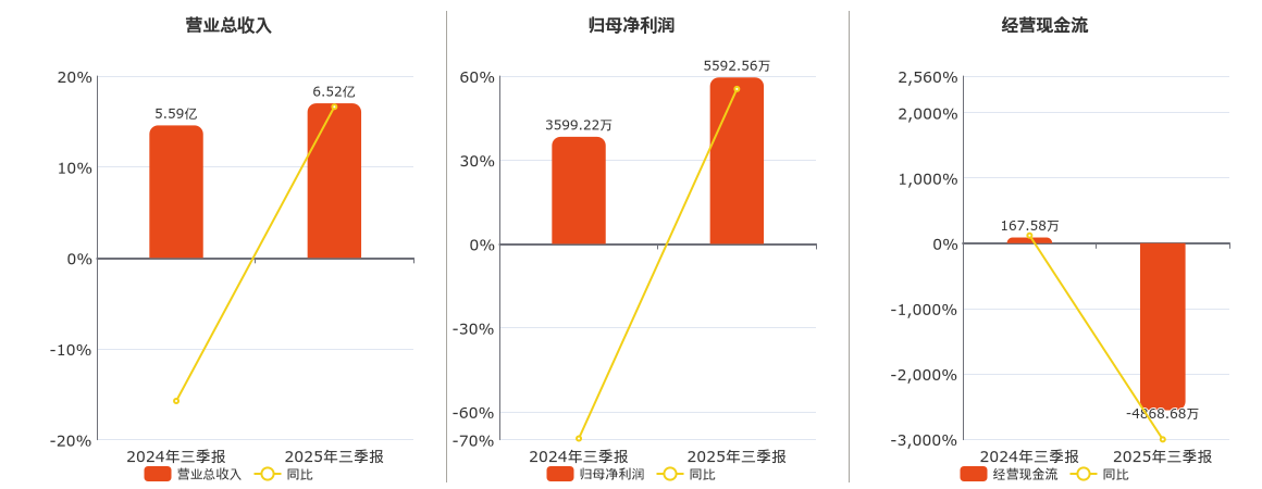 公司营业总收入为6.52亿元,较去年同报告期营业总收入增加9284.78万元,同比较去年同期上涨16.62%。归母净利润为5592.56万元,在已披露的同业公司中排名第38,较去年同报告期归母净利润增加1993.34万元,同比较去年同期上涨55.38%。经营活动现金净流入为-4868.68万元。