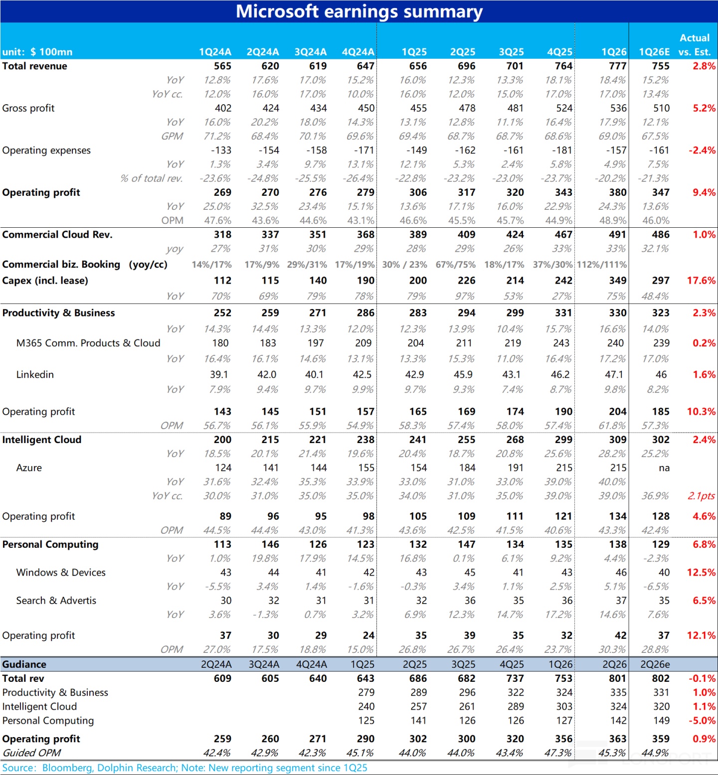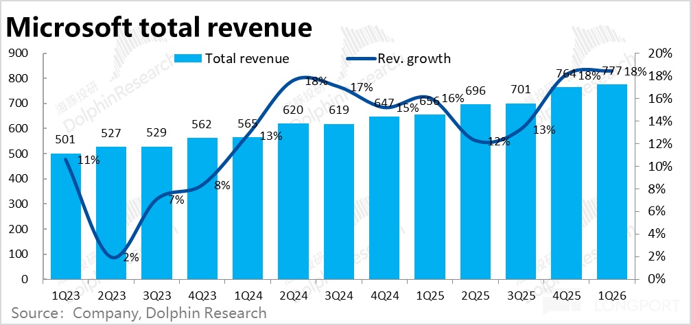 汇总上述各板块表现,微软集团整体本季度营收$777亿,同比增长18%,趋势上相比上季大体平稳、略微有提速,但相比公司上季给出的指引和彭博一致预期的15%,是明显超预期的。