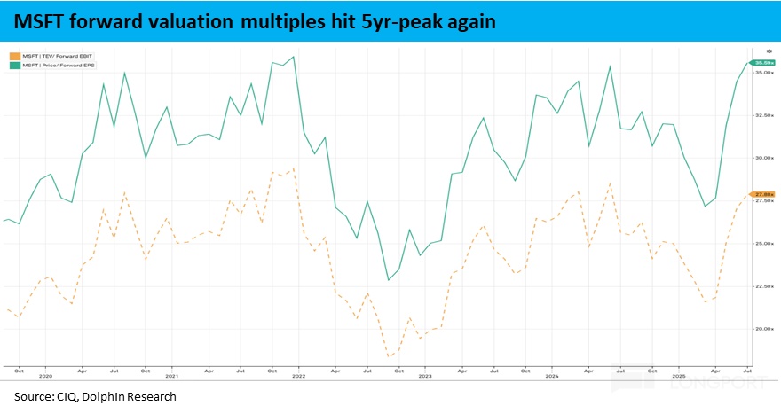 我们直接按2年后27财年的业绩为基准,按照海豚相对乐观的利润预期(比市场一致预期高10%左右),微软业绩前市值对应约30x PE。即便从这个角度看,微软的估值仍算不得便宜,无疑包含市场对微软在这轮AI浪潮中受益确定性所给出的溢价。
