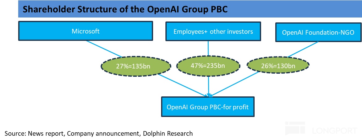 1)在将OpenAI的运营主体,由“有限盈利”模式转变为盈利为目的公众公司后,微软持有新主体约27%的份额。按最新一轮融资OAI约$5000亿的估值,即微软获得了价值约$1350亿的股份和对OAI运营主体27%的利润/亏损归属权。意味着,“有限盈利”模型下,原先微软能从OAI获得的利润上限为其投总投资额($140亿以上)8x的限制解除了。