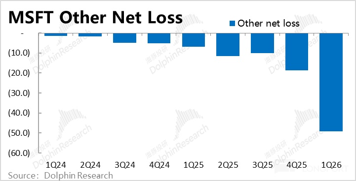 剔除其他损益中来自投资/利息损益的部分,剩下的部分在F1Q24~1Q26的两年间,由亏损仅略超1亿,大幅增长到单季亏损约49亿。反映了微软确认OAI亏损的快速扩大,对微软整体净利润的拖累也越发明显。