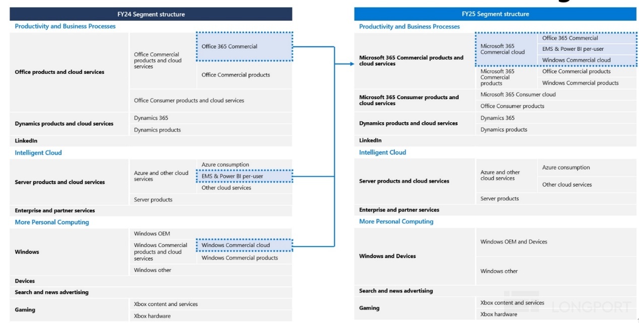 25财年开始微软对财报披露的部门结构做出不小的调整。整体的调整思路是把面向企业的各类365服务,包括Commercial Office 365, Windows 365和Security 365,全部从各自原板块调整到生产力&流程(PBP)大板块下。在25新财年首次调整时,海豚投研对此已较详细的解读,就不在每次财报中重复笔墨。下图简要概括了此次调整的变化。对口径调整更详细的看法请见1Q25点评。
