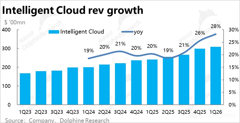 整体上,因Azure的增速环比提速1pct,且Azure外服务器产品的收入增速也扭跌转升,智慧云板块本季整体收入$309亿,同比增长28%,好于市场预期2.4%。
