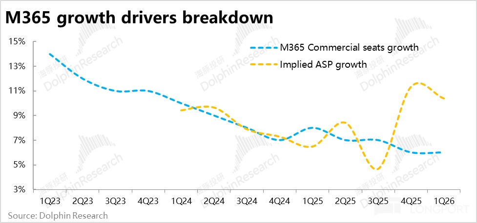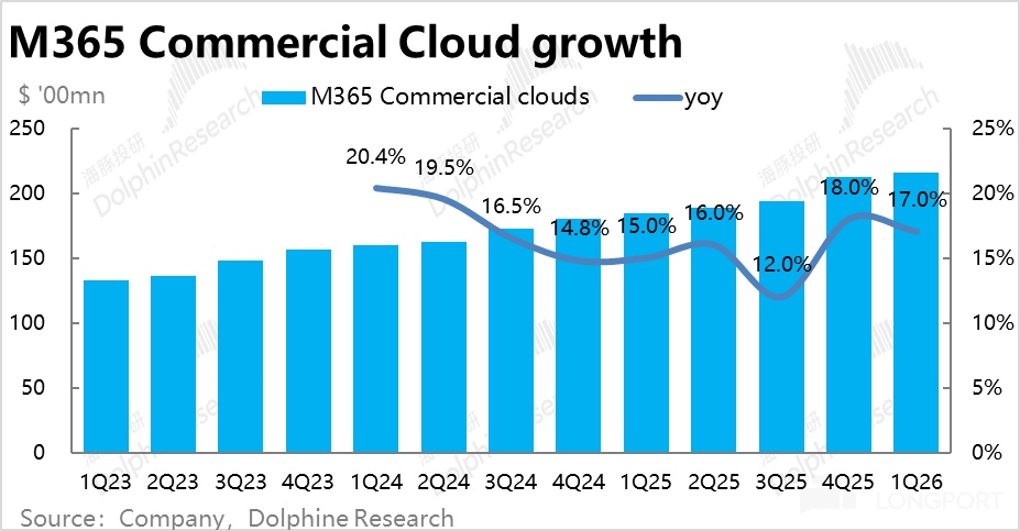 类似的,消费者M365业务,归功于今年1月份对消费版Office在12年来首次提价的利好(幅度达30%~50%左右),同样在用户量增长放缓的情况下,收入增速却提速到28%。