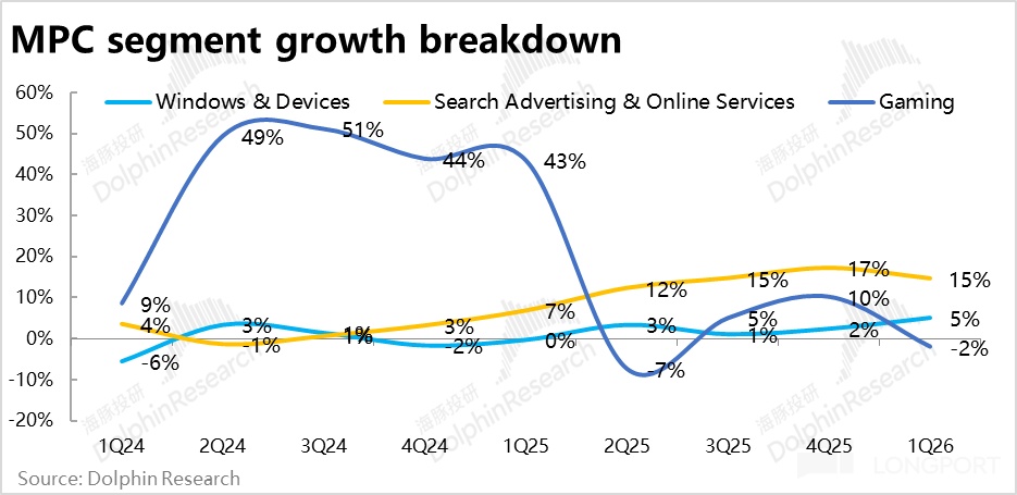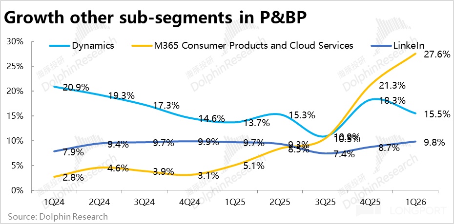 生产力板块中的其他业务, LinkedIn的收入增速在低位保持平稳,而Dynamics的增长在上季的“暂时”高点后也再度回落,没有特别值得关注之处。