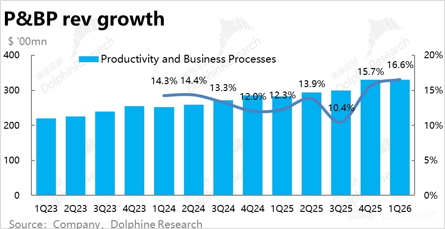 整体上,虽然核心商用M365业务增长平稳中略降,但在消费M365强劲提速增长的拉动下,本季生产力流程板块的整体的营收增速为16.6%,较上季小幅提速,且同样小超彭博预期2.3%。