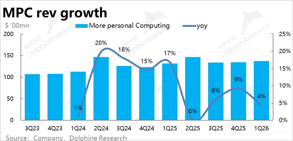 在完全渡过了并表动视暴雪的影响期后,更多个人计算板块的增长开始回归常态。本季度营收增长4%,没有公司先前指引的会负增长那么差。但维持在低个位数的增速,意味着仍没有值得特别关注之处。