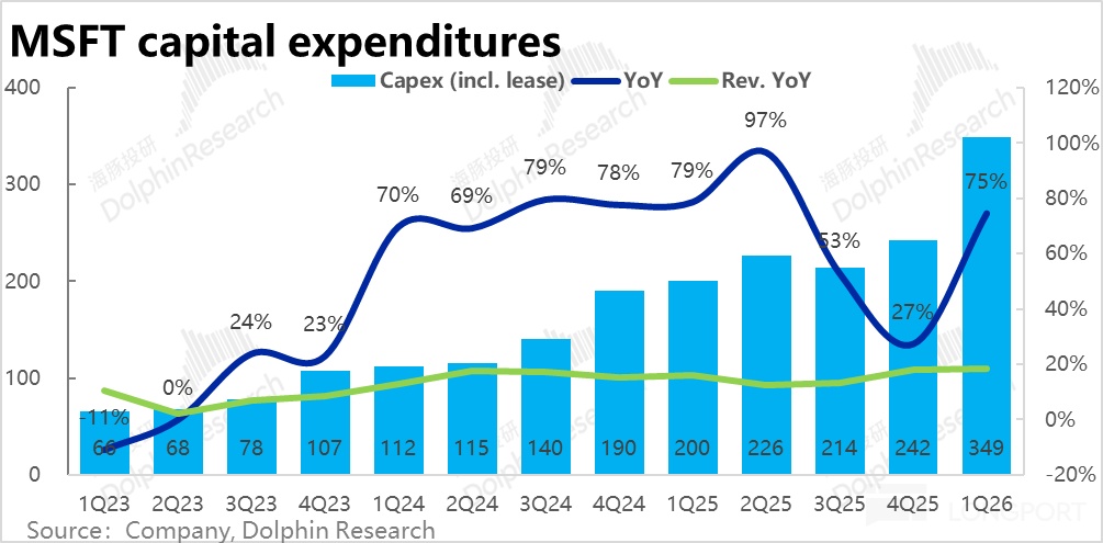 3、Capex再度爆拉:本季微软Capex(包括租赁)支出达到了349亿,环比上季度再度拉高超$100亿,再创历史新高。尽管市场已普遍预期微软本季的Capex支出会再度上调,预期放到了300亿左右,实际仍大超预期。