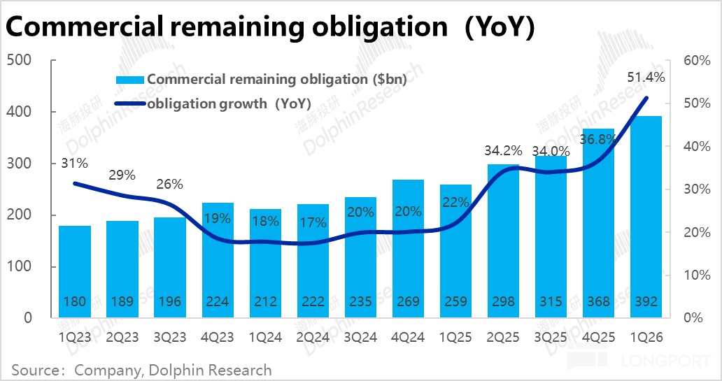 具体来看,本季新签企业合同金额同比暴涨112%,公司表示主要是OpenAI向Azure签订的使用承诺合同(其中不包括几天前签订的$2500亿承诺)。